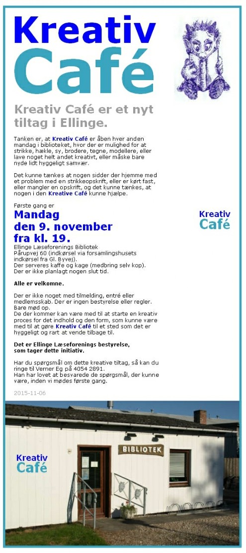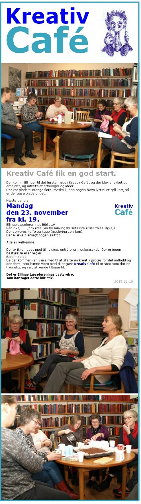 Der efter følger den artikel som var på hjemmesiden dagen efter den første Kreativ Café, og man kan læse, at der mødt ni Ellinger frem den aften.
